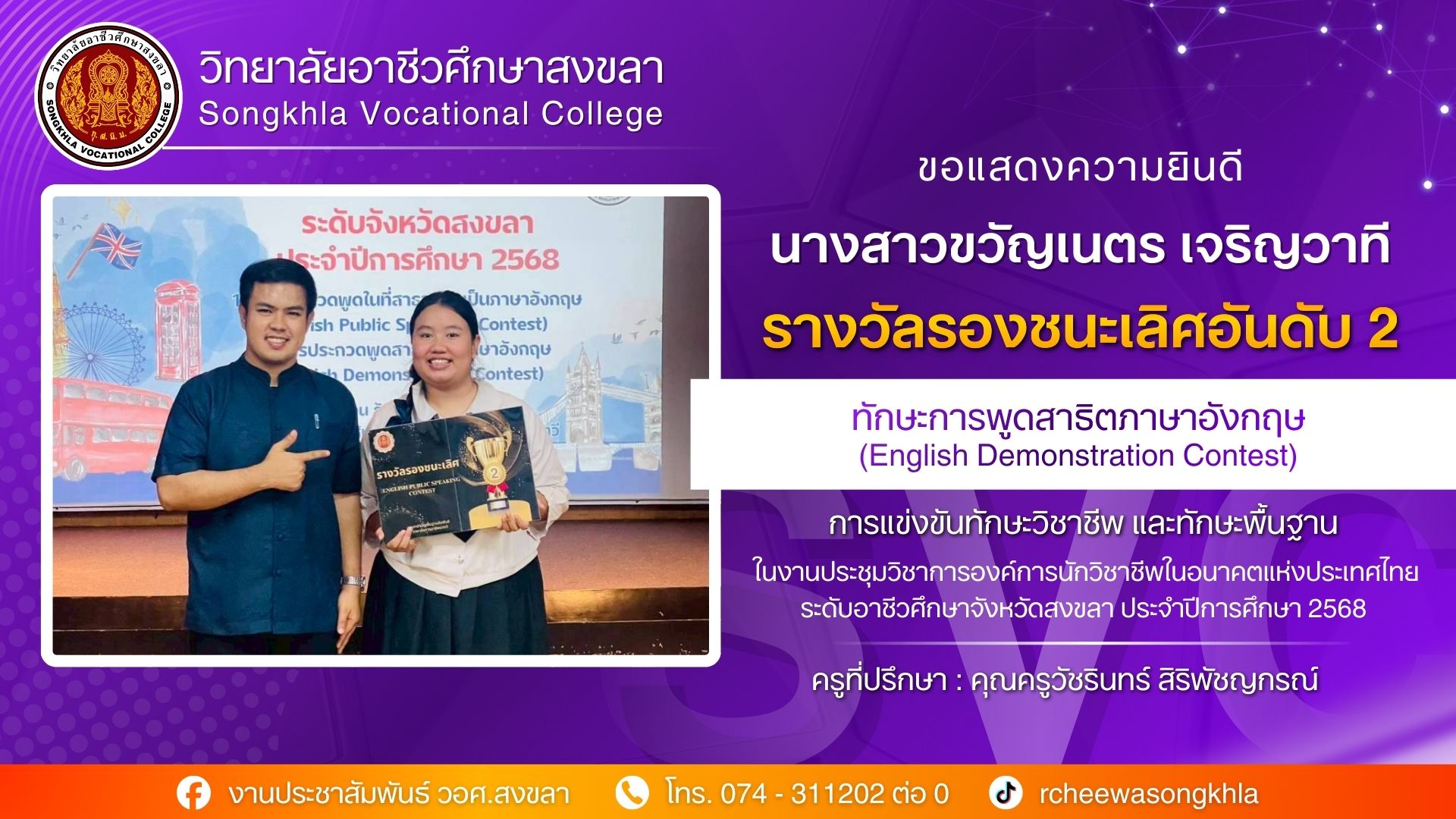 ทักษะการพูดสาธิตภาษาอังกฤษ (English Demonstration Contest) การแข่งขันทักษะวิชาชีพ และทักษะพื้นฐาน ในงานประชุมวิชาการองค์การนักวิชาชีพในอนาคตแห่งประเทศไทย ระดับอาชีวศึกษาจังหวัดสงขลา ประจำปีการศึกษา 2568