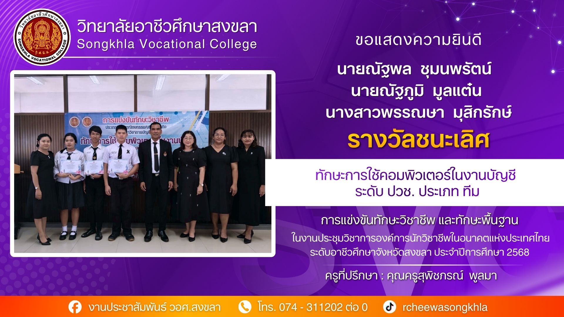 ทักษะการใช้คอมพิวเตอร์ในงานบัญชี ระดับ ปวช. ประเภท ทีม การแข่งขันทักษะวิชาชีพ และทักษะพื้นฐาน ในงานประชุมวิชาการองค์การนักวิชาชีพในอนาคตแห่งประเทศไทย ระดับอาชีวศึกษาจังหวัดสงขลา ประจำปีการศึกษา 2568