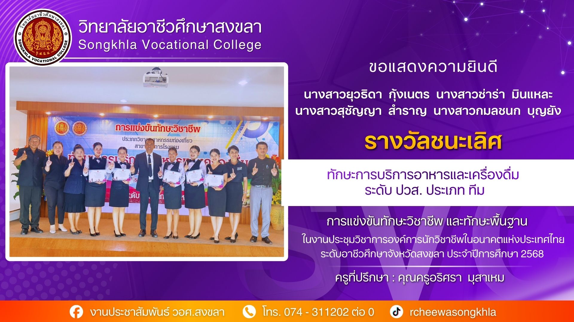 ทักษะการบริการอาหารและเครื่องดื่ม ระดับ ปวส. ประเภท ทีม การแข่งขันทักษะวิชาชีพ และทักษะพื้นฐาน ในงานประชุมวิชาการองค์การนักวิชาชีพในอนาคตแห่งประเทศไทย ระดับอาชีวศึกษาจังหวัดสงขลา ประจำปีการศึกษา 2568