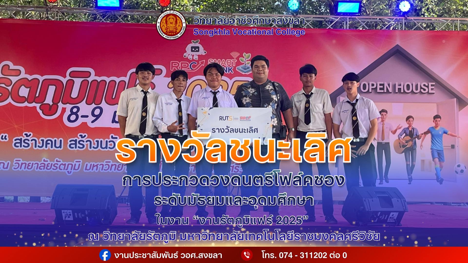 ในการประกวดวงดนตรีโฟล์คซอง ระดับมัธยมและอุดมศึกษา ใน “งานรัตภูมิแฟร์ 2025” ณ วิทยาลัยรัตภูมิ มหาวิทยาลัยเทคโนโลยีราชมงคลศรีวิชัย โดยมี คุณครูสันติ ทองมี เป็นผู้ครูฝึกซ้อมและควบคุม