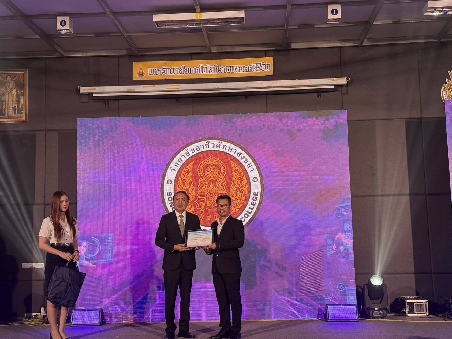วันที่ 8 มกราคม 2569 นางอมรรัตน์ จันวัฒนะ ผู้อำนวยการวิทยาลัยอาชีวศึกษาสงขลา มอบหมายให้นายธีระ โพธิ์ทอง รองผู้อำนวยการฝ่ายพัฒนากิจการนักเรียน นักศึกษา พร้อมด้วย นางสาวนิชาภัทร นวลมังสอ หัวหน้างานแนะแนวอาชีพ และจัดหางาน เข้าร่วมพิธีเปิด และเข้ารับรางวัลสถานศึกษาที่มีนักศึกษาเข้าศึกษาสูงสุด ประจำปีการศึกษา 2568 ในงานนิทรรศการวิชาการราชมงคลศรีวิชัยแฟร์ ณ คณะวิศวกรรมศาสตร์ มหาวิทยาลัยเทคโนโลยีราชมงคลศรีวิชัย