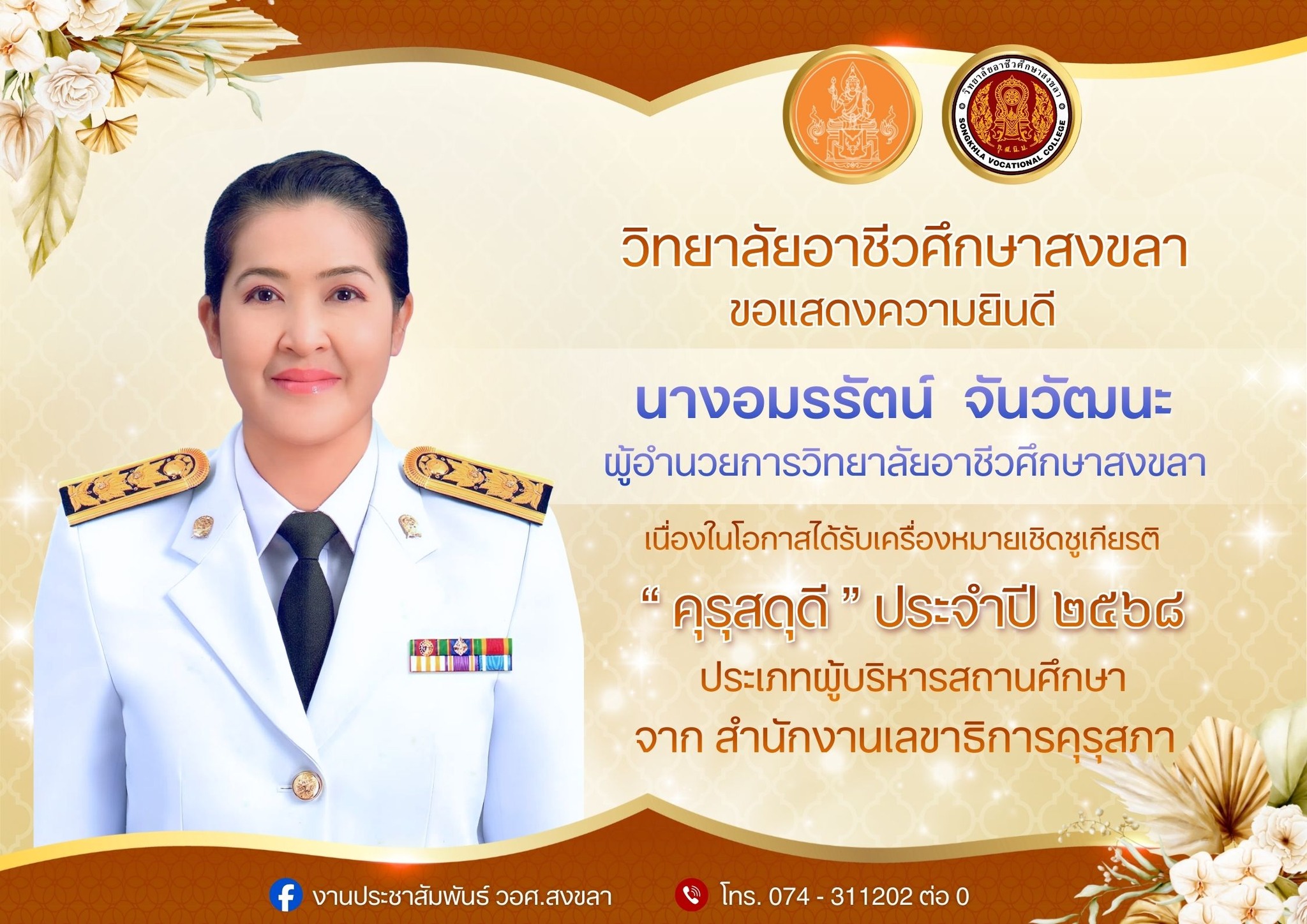 นางอมรรัตน์ จันวัฒนะ ผู้อำนวยการวิทยาลัยอาชีวศึกษาสงขลา วิทยฐานะ ผู้อำนวยการชำนาญการพิเศษ เนื่องในโอกาสได้รับเครื่องหมายเชิดชูเกียรติ “#คุรุสดุดี” ประจำปี ๒๕๖๘ ประเภทผู้บริหารสถานศึกษา จาก สำนักงานเลขาธิการคุรุสภา