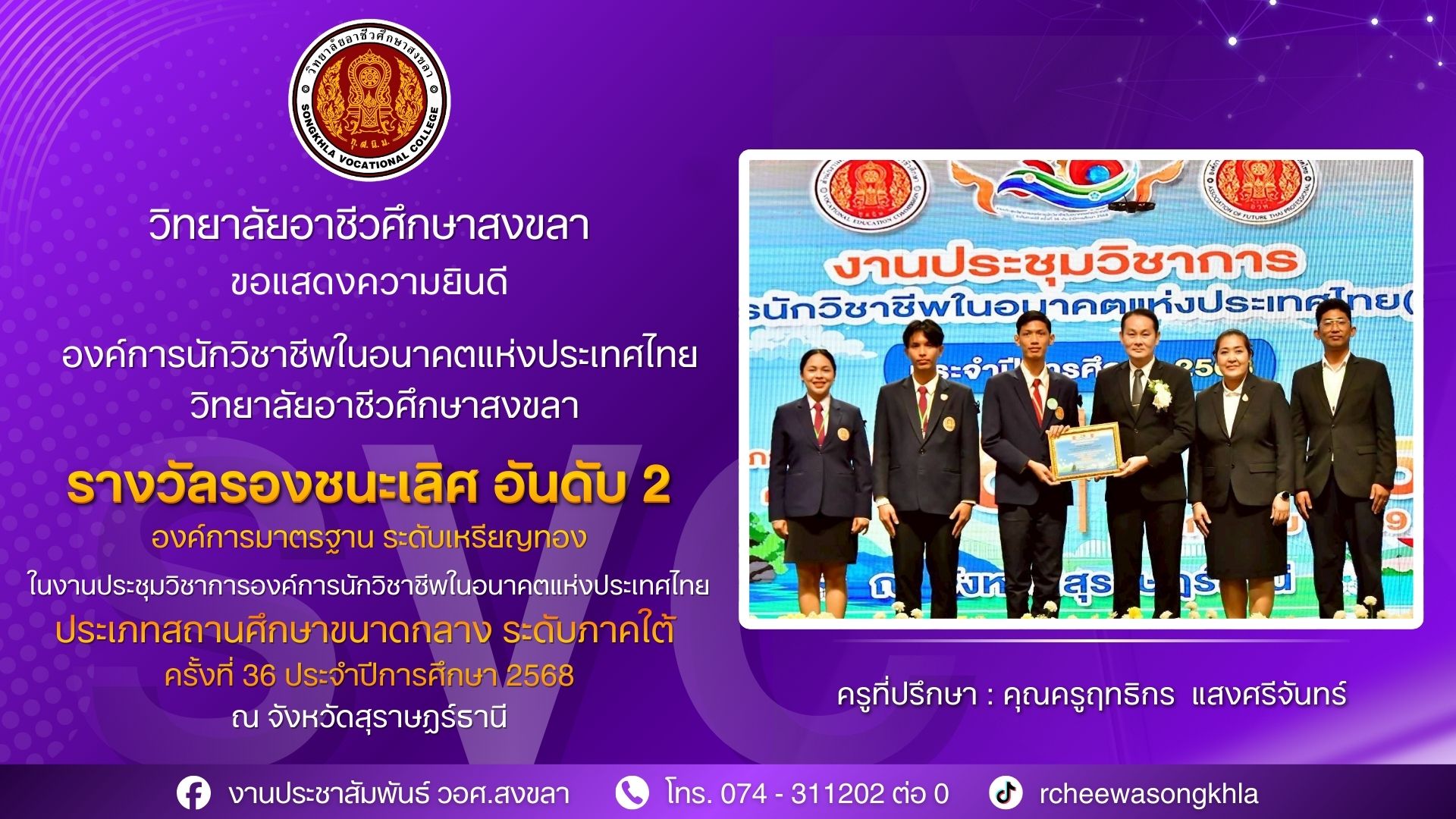 วิทยาลัยอาชีวศึกษาสงขลาขอแสดงความยินดีกับ องค์การนักวิชาชีพในอนาคตแห่งประเทศไทย วิทยาลัยอาชีวศึกษาสงขลา#รางวัลรองชนะเลิศอันดับ2