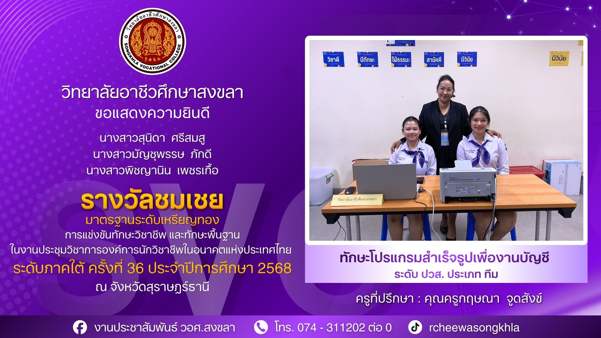 วิทยาลัยอาชีวศึกษาสงขลา ขอแสดงความยินดีกับ นางสาวสุนิดา ศรีสมสู , นางสาวมัญชุพรรษ ภักดี , นางสาวพิชญานิน เพชรเกื้อ #รางวัลชมเชย